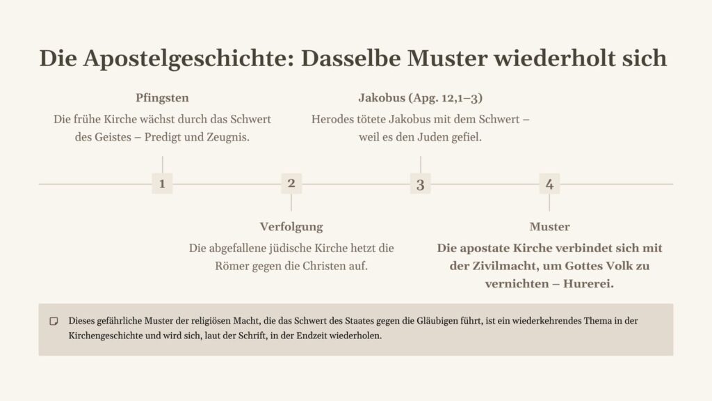 Wenn Du die Apostelgeschichte liest, siehst Du genau das: Die Gemeinde versucht nicht, Rom zu kontrollieren. Stattdessen leidet sie unter Verfolgung. Wieder und wieder werden staatliche Stellen gegen die Nachfolger Jesu aufgehetzt. Das Muster bleibt dasselbe: religiöser Widerstand bedient sich weltlicher Macht. So wurde Jakobus mit dem Schwert getötet, und selbst danach blieb der Druck bestehen und wird sich auch in der Endzeit wiederholen (wir werden künftig noch darauf zurück kommen).