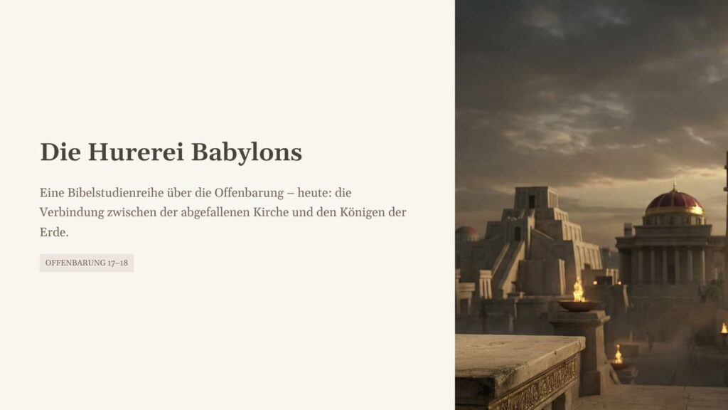 Babylons Hurerei zeigt, was geschieht, wenn Religion die Macht dieser Welt sucht. Das Evangelium zeigt, was geschieht, wenn Menschen sich wieder ganz an Christus binden. Darum geht es letztlich nicht nur um Prophetie, sondern um Treue. Nicht nur um Systeme, sondern um Beziehung. Nicht nur um Warnung, sondern um Hoffnung.